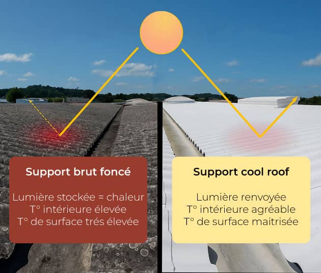 Les produits cool roof utilisent des matériaux avec une haute réflectivité solaire et une émissivité thermique forte. La peinture va limiter l'absorption de la chaleur du toit grâce à la réflexion du rayonnement solaire. Grâce à cet effet albédo, la toiture est plus fraiche, le transfert de chaleur est limité, le bâtiment va refroidir et baisser ses besoins en énergie.