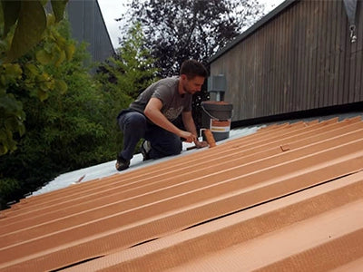 Assurez vous d'être à l'aise en toiture (surtout si celle-ci est en pente) avec un rouleau et un pot de peinture. Pensez-bien à vous sécuriser.